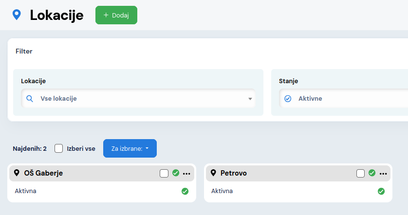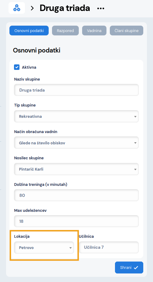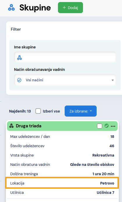Dodana je bila možnost vnosa lokacij, ki jih lahko potem izberete pri dodajanju in urejanju skupin. Lokacijo dodate s klikom na gumb “Dodaj