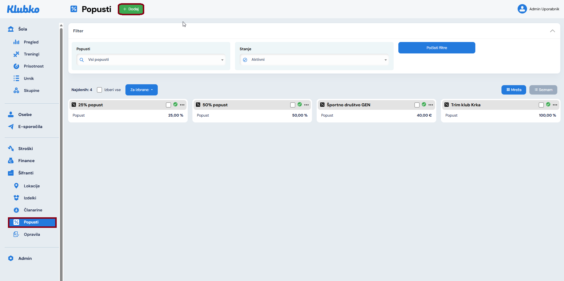 Vnos popusta potrdite s klikom na gumb Shrani in s tem ste uspešno dodali nov popust: