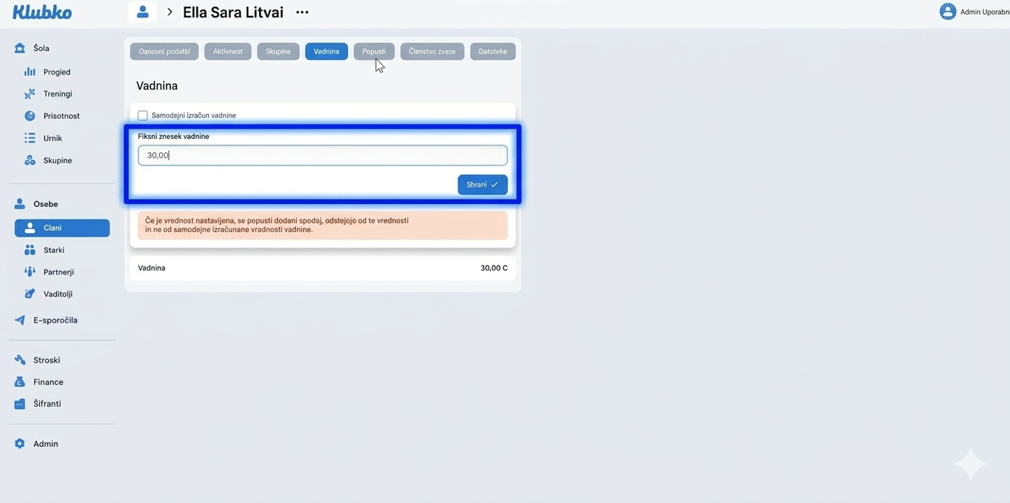 Vadnina člana po dodanem popustu vidna v seznamu članov: