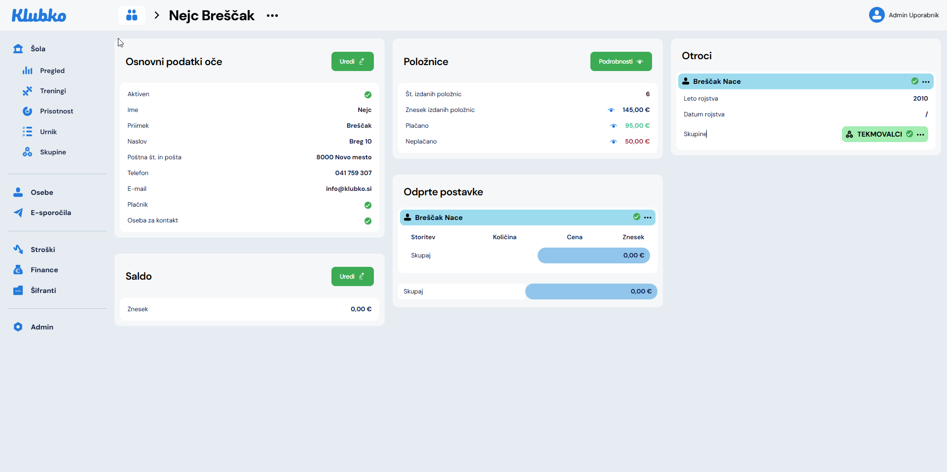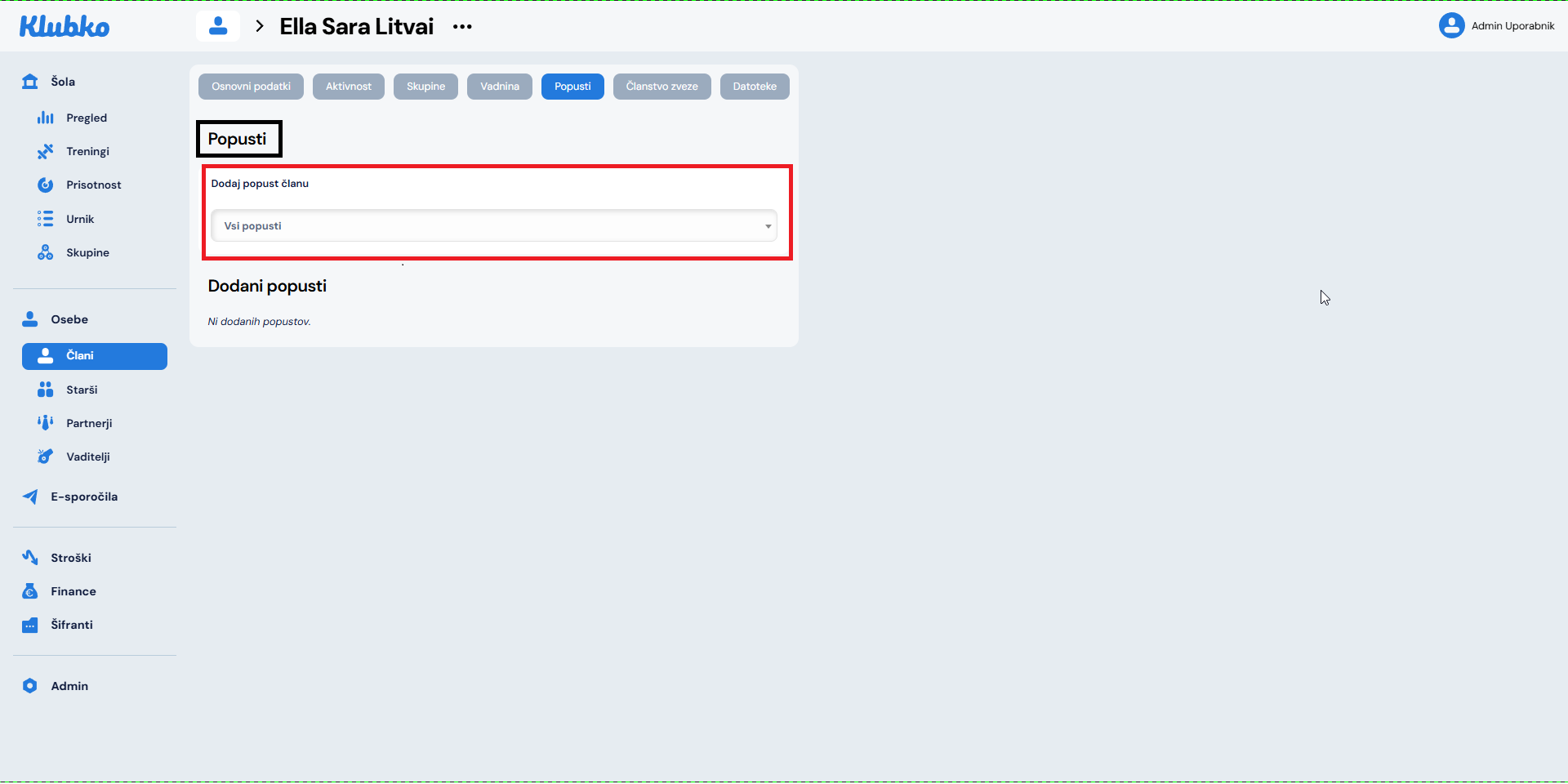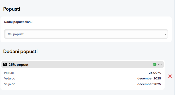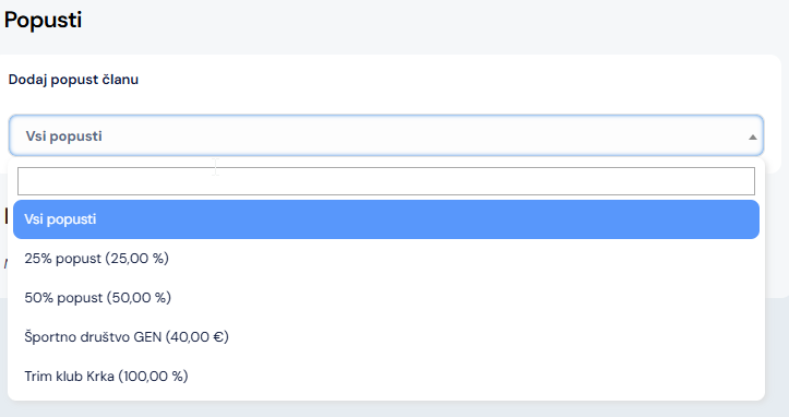 Popuste je zaradi priročnega kontekstnega menija možno dodati vsepovsod, kjer je član prikazan (v seznamu članov, treningih, podrobnosti položnice, starši,…):