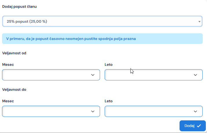 nakar se vam prikaže obrazec za določitev obdobja veljavnosti popusta. Če je popust veljaven neomejeno postopek zaključite s klikom na gumb Dodaj v nasprotnem primeru izberete mesec in leto za obdobje, ko je popust aktiven in potrdite s klikom na gumb Dodaj: