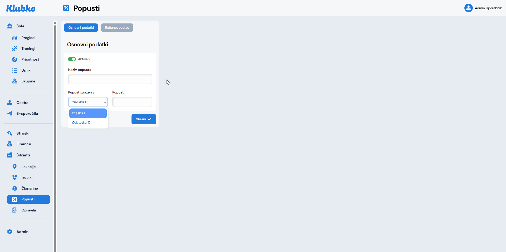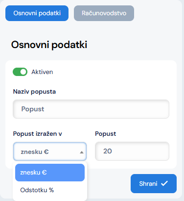 S klikom na gumb Dodaj se odpre obrazec za vnos novega popusta. Vnesete naziv popusta in v naslednjem koraku izberete ali je popust izražen kot znesek ali kot odstotek. Nato vnesete vrednost.