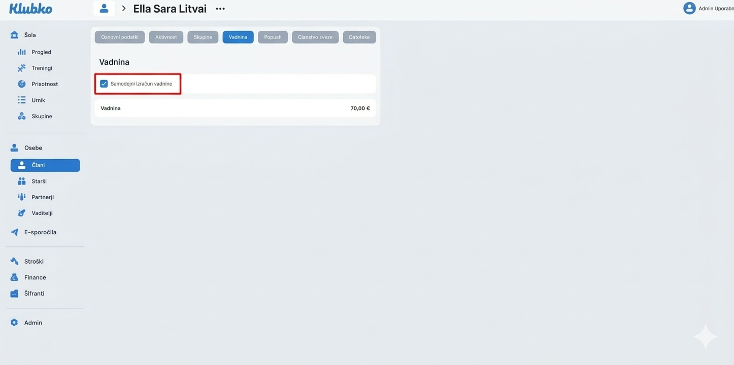 Pri načinu “Samodejni izračun vadnin” se, kot že naziv pove, vadnina izračuna samodejno iz prednastavljenih vrednosti skupin in določenega števila obiskov člana na teden. Pomeni, da se pri spremembi cen v skupini vadnina samodejno preračuna za vsakega člana, ki je v tej skupini.
