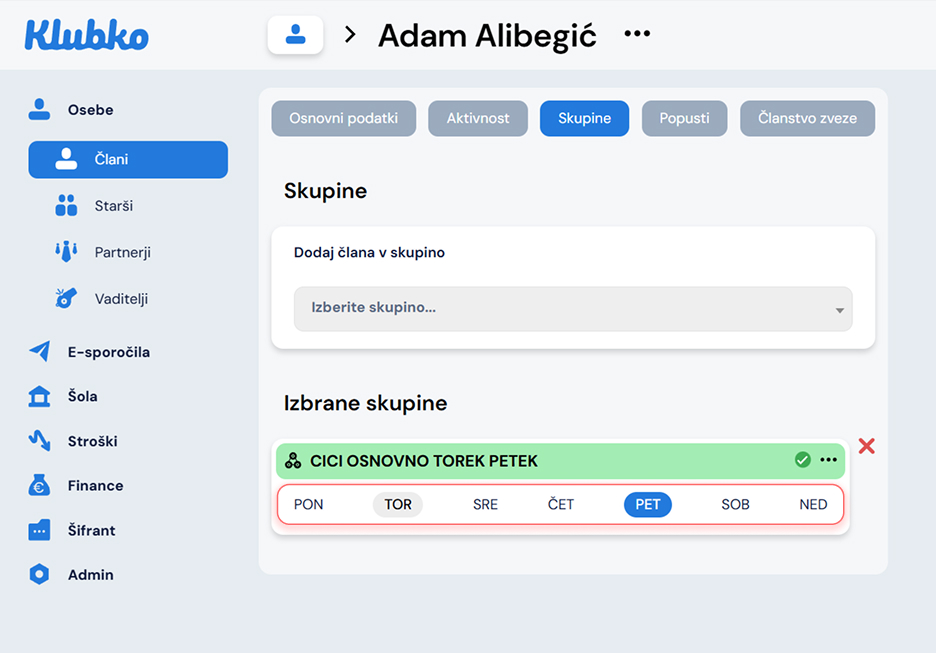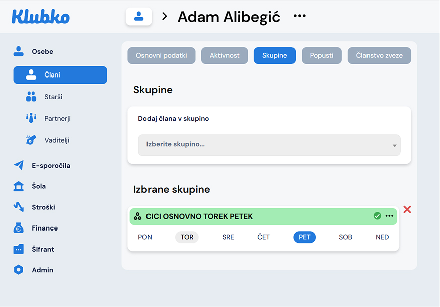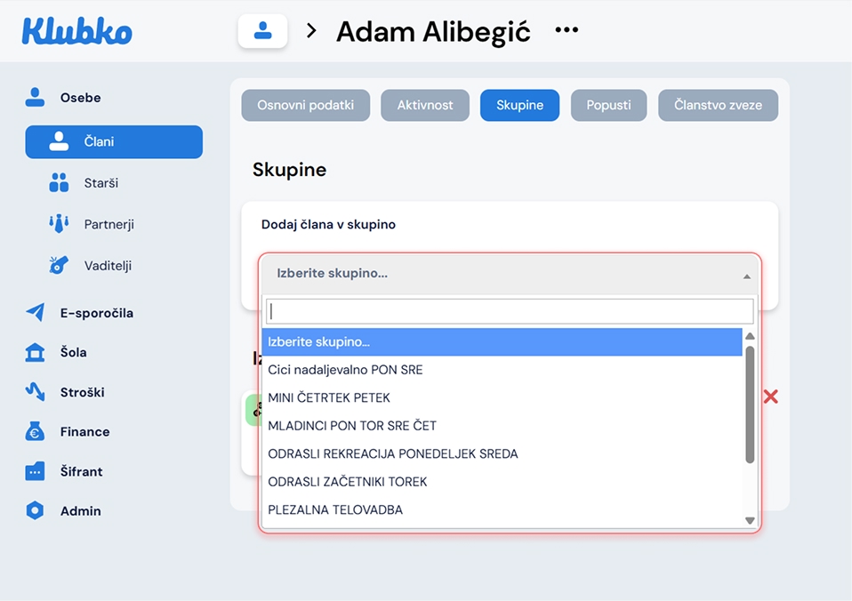 Ko ste dodali otroka v skupino se vam spodaj prikaže dodana skupina.