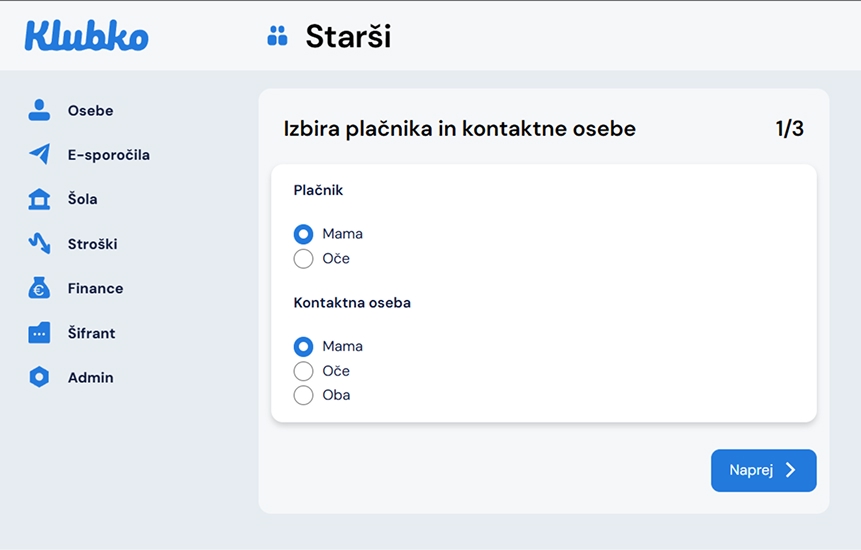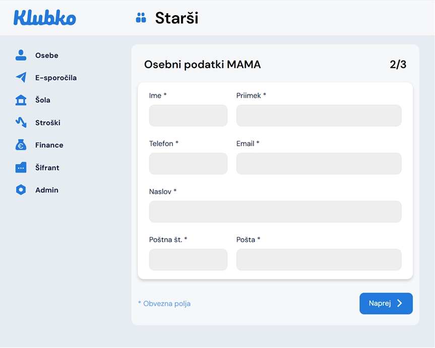 - Vnesite podatke o staršu in potrdite z gumbom naprej.