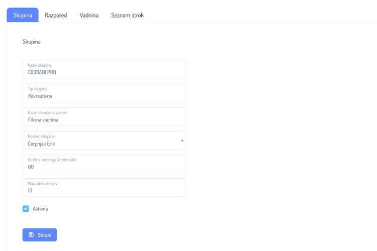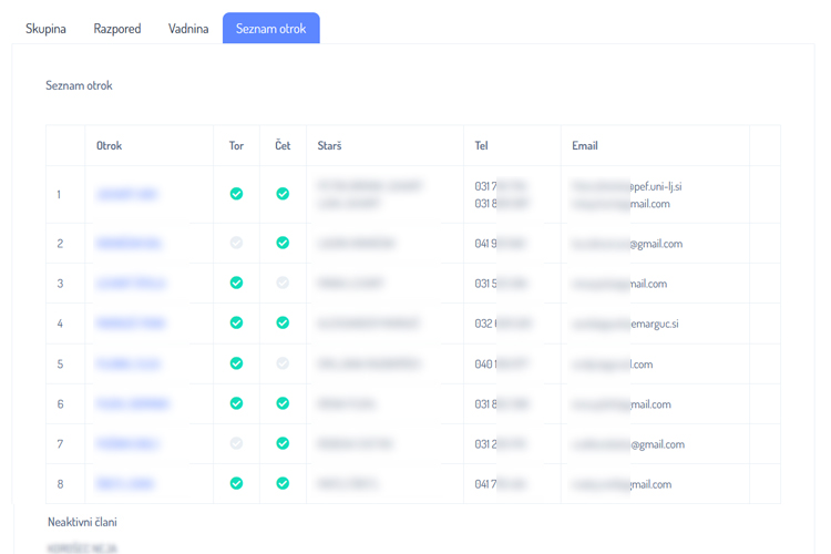 - Prikaz vseh otrok, ki so dodani v skupini.