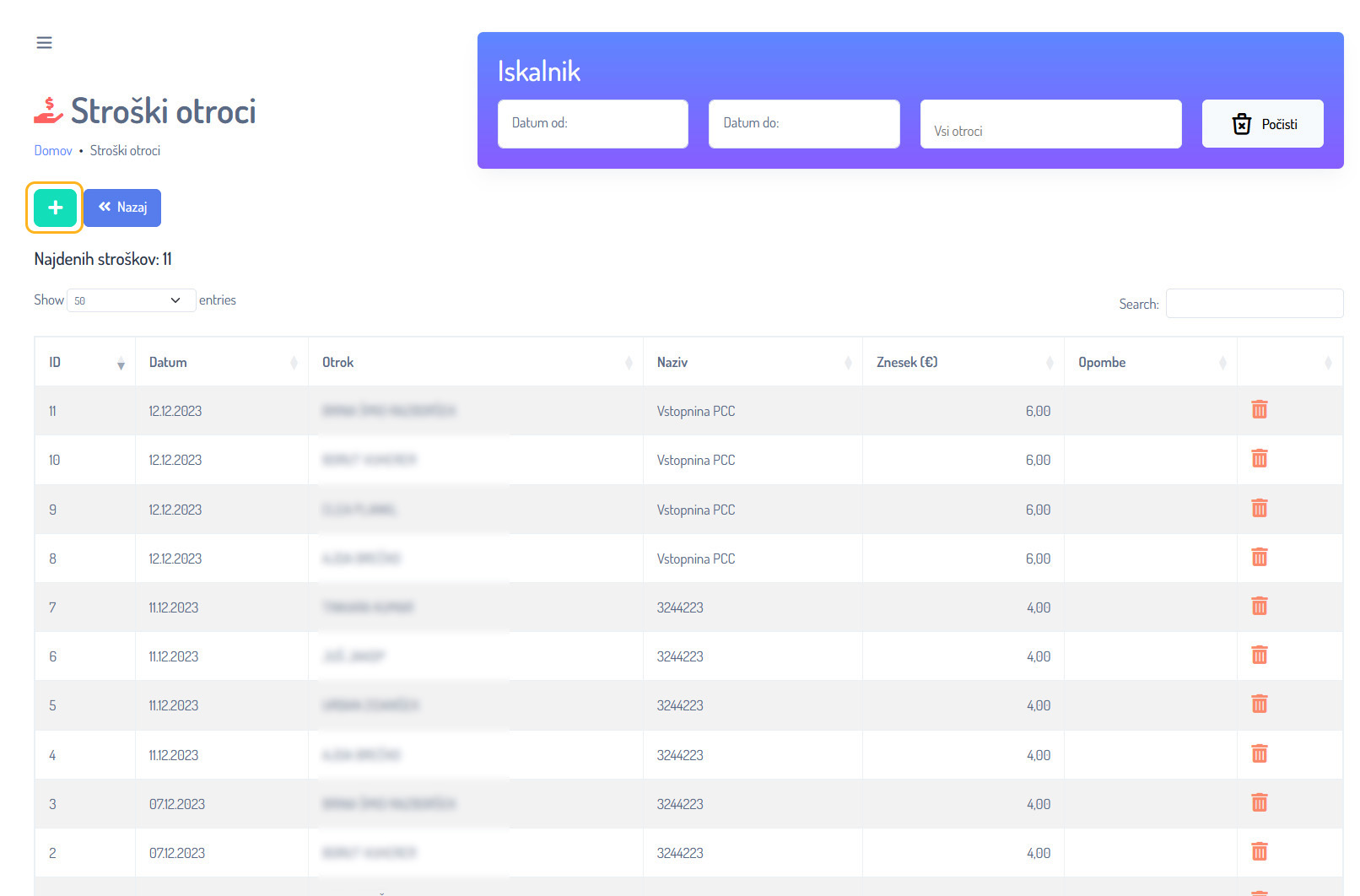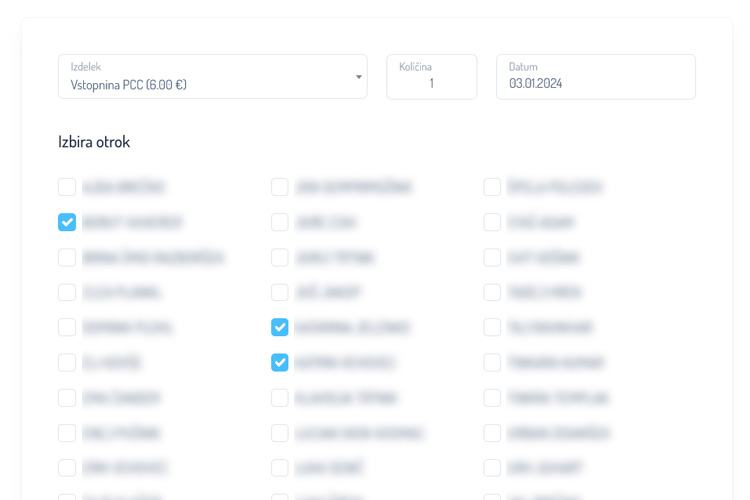 Iz spustnega seznama izberite izdelek in označite otroka, kateremu želite dodati izbrani strošek.
