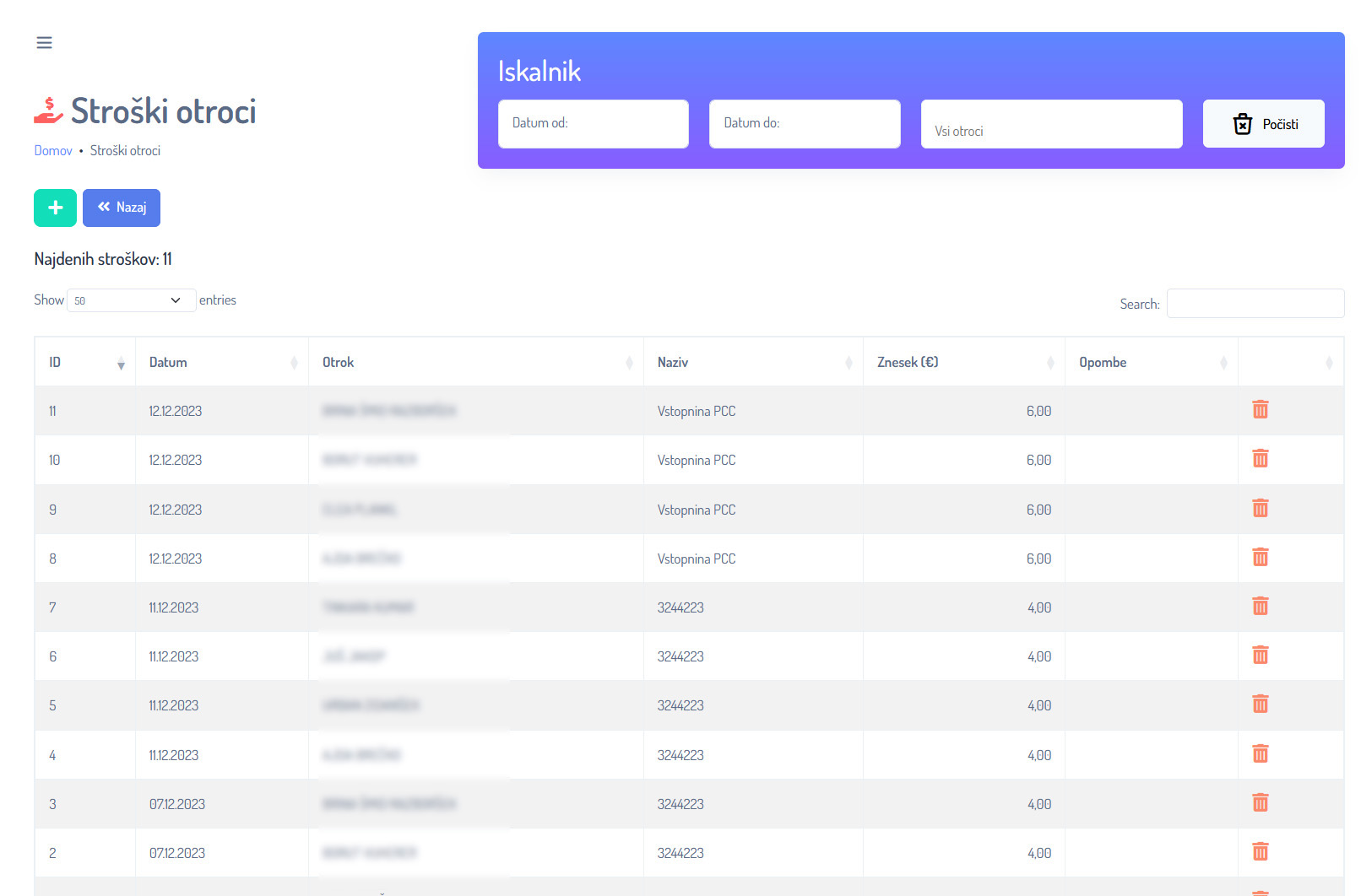 Strošek lahko odtstranite z pritiskom na ikono (Koš). Strošek ponovno dodate, kot je opisano v razdelku dodajanje